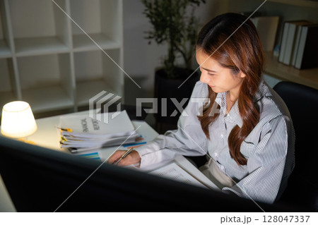 Late Night Focus. A woman diligently working on documents in a quiet office.