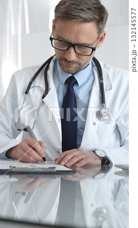 Doctor man thinking about diagnosis, writing patient medical anamnesis, focused on healthcare and hospital work. Medicine and health care