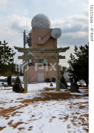 深山~るり渓ハイキングコースより頂上に到達。後方には、鳥居と深山レーダ雨量観測所が見える。