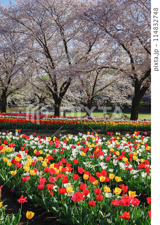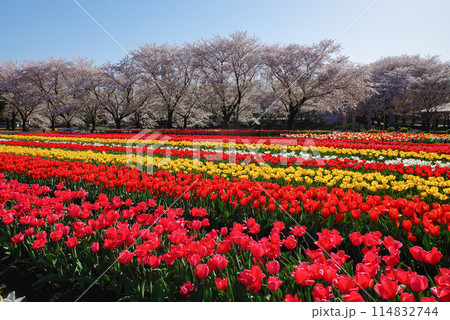 カラフルなチューリップと桜並木 深谷グリーンパーク アクアパラダイス・パティオ 埼玉県深谷市