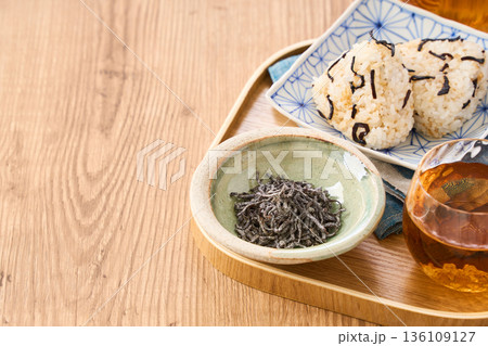 小鉢に盛った塩昆布と塩昆布おにぎり