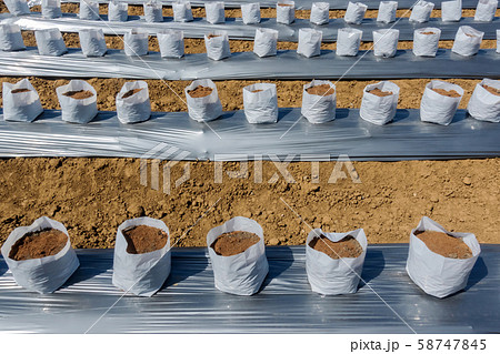 Row of Coconut coir in nursery white bag for farm with fertigation , irrigation system to be used for growing strawberries.