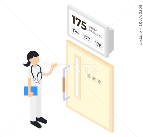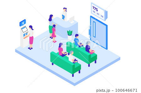 待合室と人々のアイソメトリックイラスト(クリニック・病院)