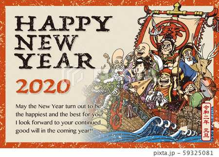 2020年賀状テンプレート「七福神と宝船」ハッピーニューイヤー 日本語添え書き付