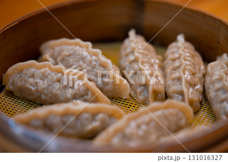 Steamed Korean dumplings Mandu with meat and vegetables in a bamboo steamer