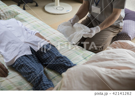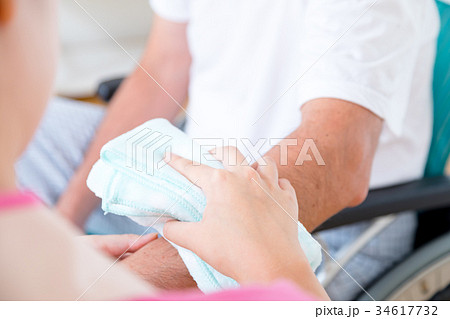 介護士と高齢者 高齢者介護 介助シーン 清拭 体を拭く ボディパーツ パーツカット 顔なし