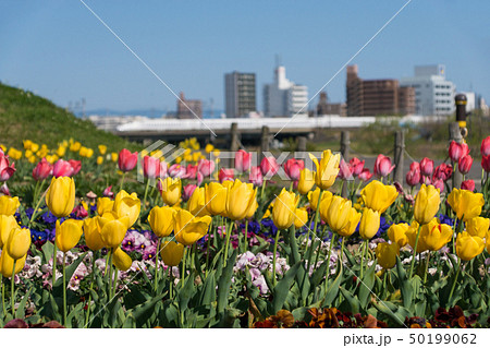 チューリップ畑と東海道新幹線