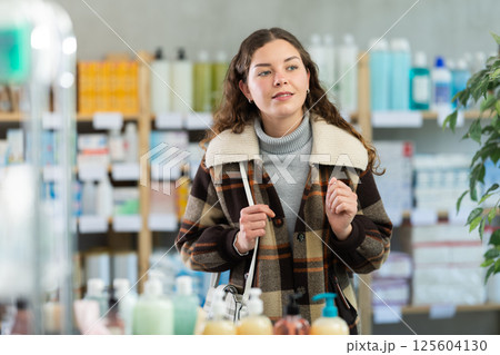 Portrait of girl in winter clothes shopper choosing some products in supermarket