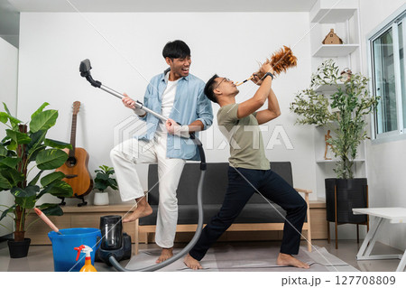 Energetic Cleaning Duo. Two friends having fun while cleaning their living room.
