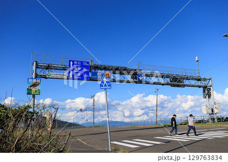 静岡県静岡市由比町の国道一号線から見た東名高速道路と富士山