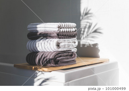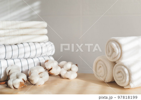 Bath fresh towels pile soft textile cotton body care neatly folded white gray laundry flower shelf