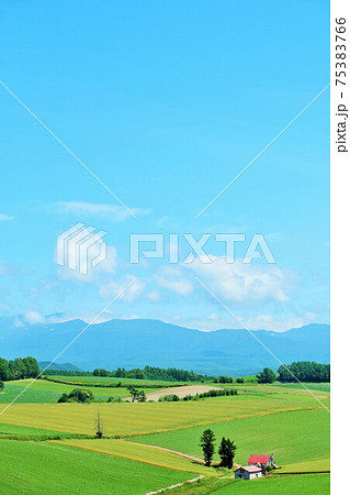 【北海道美瑛町】青空と赤い屋根のある丘 7月
