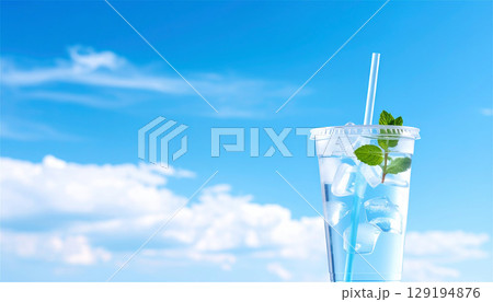 青空と白い雲の下で氷水とミントを楽しむ夏の清涼モックアップ|プラスチックカップに氷たっぷりで爽快感あ