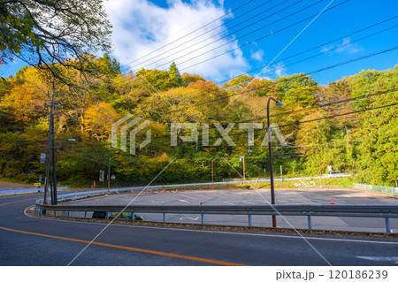 秋の群馬県高崎市 榛名神社参拝用の市営駐車場(県道33号)付近から大鳥居方面を見る