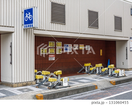 都市部の歩道に設けられた無人管理の有料駐輪スペースと料金精算機