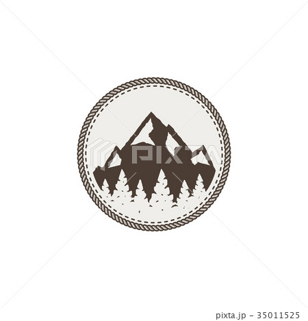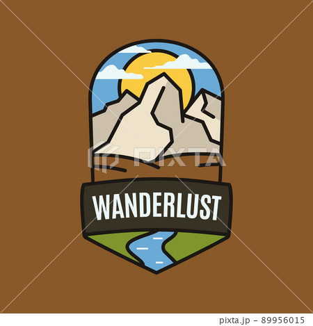 Vintage wanderlust adventure logo, hiking emblem design with camping scene, mountains and river. Unusual line art retro style sticker. Stock art