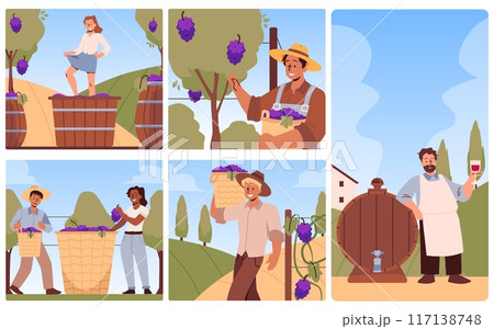 A collection of vector illustrations with scenes of wine creation the background of grape plantations