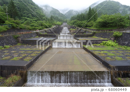 大倉川農地防災ダムの堤体と横越流式洪水吐