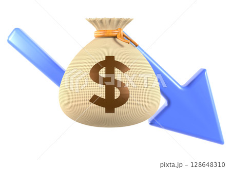 損失や収益減少を示すお金の袋と下向き矢印の3Dイラスト