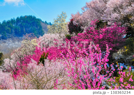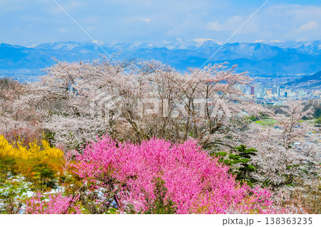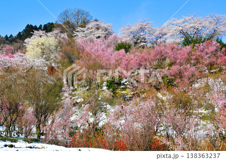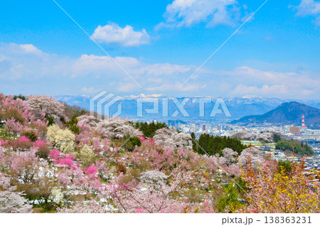 春爛漫の花見山、色鮮やかな桜と花々が山を彩る桃源郷のパノラマ風景