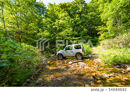 RV車で渓流沢を渡る