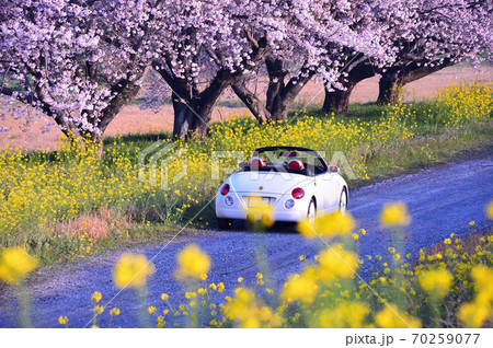 桜と菜の花と小道とカブリオレ(渡良瀬遊水地)