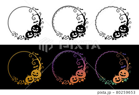 ハロウィンのカボチャと木の飾り枠_丸いフレーム_シルエット素材セット