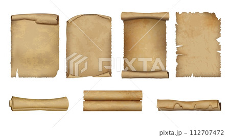 Old parchment. Paper scroll. Ancient papyrus. Page of vintage book or letter. Rolled age texture. Medieval manuscript. Historical contract. Fairytale document. Vector antique curled set