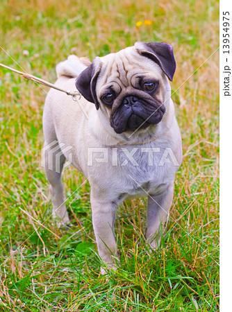 dog fawn pug breed on green grass in summer