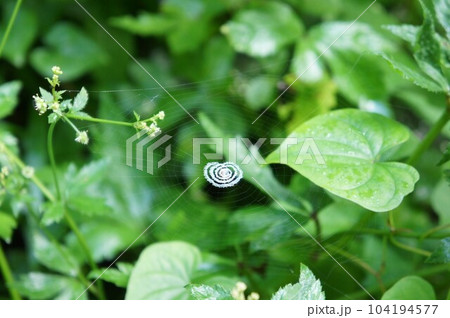 青葉に囲まれ、空に小宇宙のような蜘蛛が創る芸術的なレース編み柄の隠れ帯蜘蛛の巣