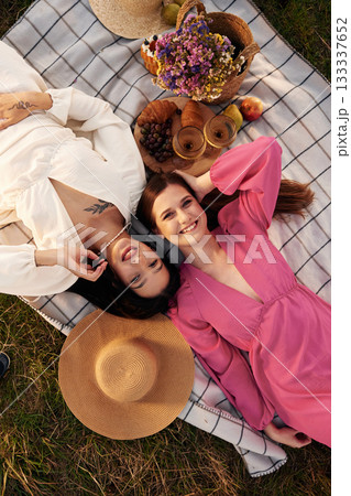 Top view, lying down. Lesbian couple is together on the picnic in nature