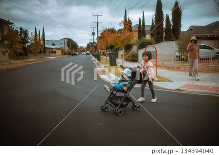 Two Women Happily Enjoying a Leisurely Walk While Pushing a Baby Stroller in the Park