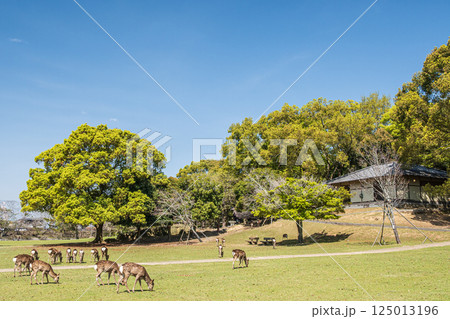 新緑の奈良公園 シカの群れ
