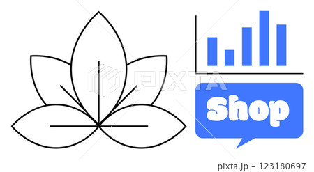 Lotus flower outlined in black, blue graph bars, and a blue speech bubble with the word Shop in white. Ideal for wellness, e-commerce, business growth, retail analysis, and marketing