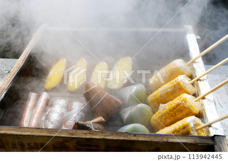 霧島温泉の蒸気蒸しされる野菜とお団子