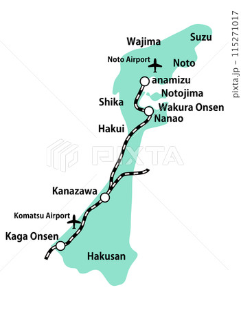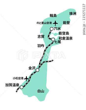 石川県の線路空港英語地名入り地図イラスト_緑色