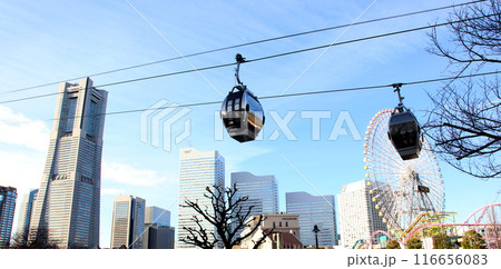運河パークから見渡す横浜エアキャビンとランドマークタワーの風景