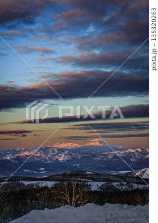 北海道・摩周第一展望台の朝焼け 雪に覆われた山並みと美しい空