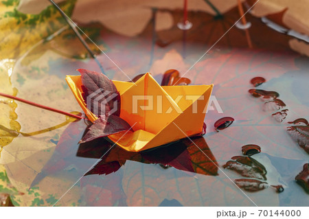 Origami paper boat and scenic fallen leaves in a water. Concept of bright fall
