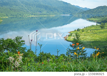 夏の野反湖を彩る高原の花畑と緑広がる爽やかな湖畔風景(群馬・中之条町)