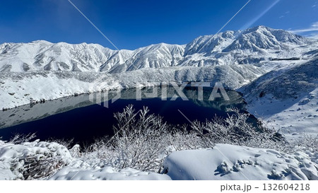 雪に覆われた山と池の風景