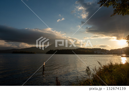 朝日に照らされる湖と雲に包まれた山