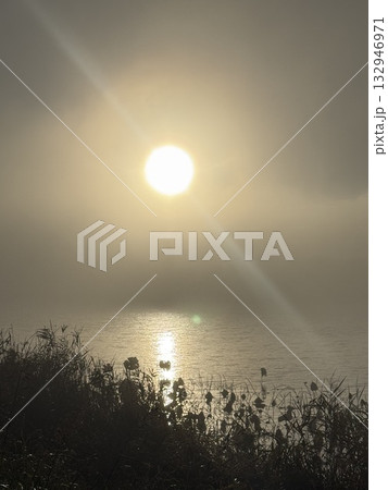 朝霧の中で輝く太陽と黄金色の湖面