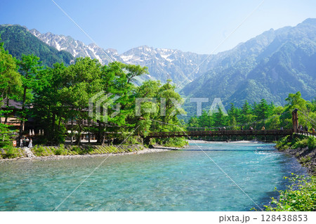 長野 上高地 新緑に包まれる河童橋と美しい梓川