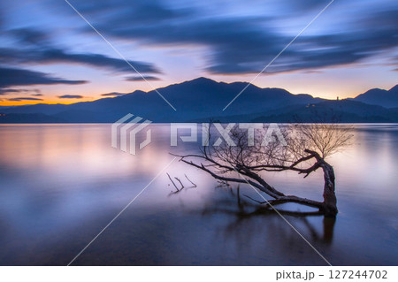 日月潭-水中樹 日月潭風景—美麗的湖面景觀映照出奇幻的日出天空。亞洲台灣南投縣著名的旅遊景點。