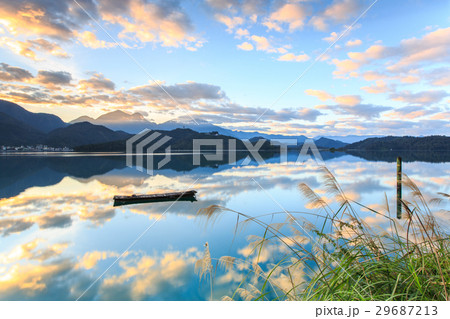 日月潭風景—美麗的湖面景觀映照出奇幻的日出天空。亞洲台灣南投縣著名的旅遊景點。