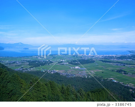 滋賀県湖北地方春の田園と新緑の山