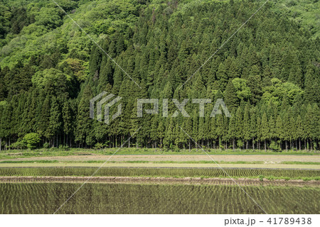 初夏の田んぼと針葉樹林