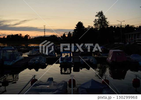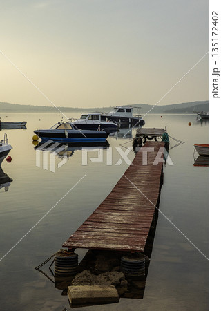 Wooden dock boats on sunset time