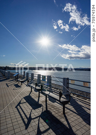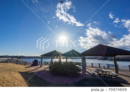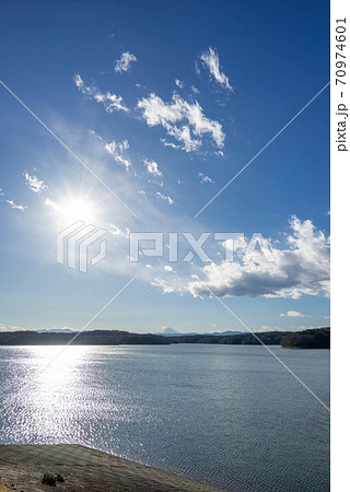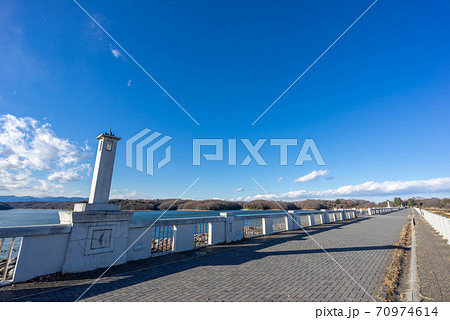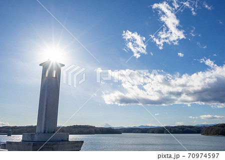 挟山湖 山口貯水池ダム 橋の欄干と太陽